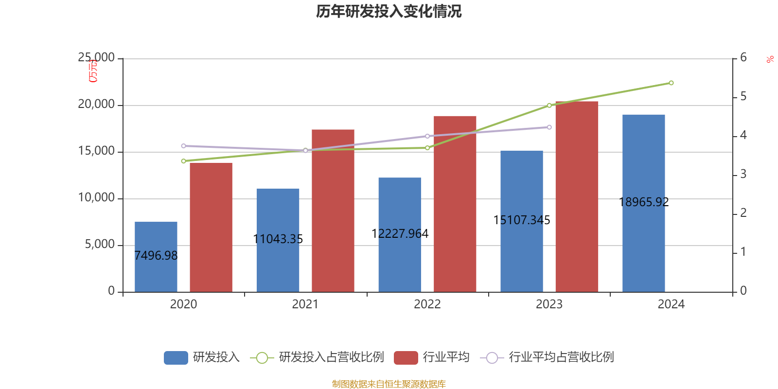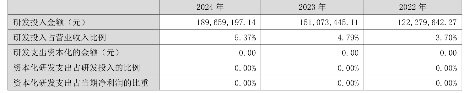 2024年全年牛牛策略,公司研发投入金额为1.9亿元,同比增长25.54%;研发投入占营业收入比例为5.37%,相比上年同期上升0.58个百分点。此外,公司全年研发投入资本化率为0。