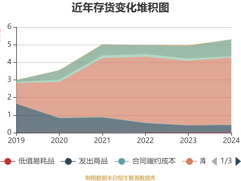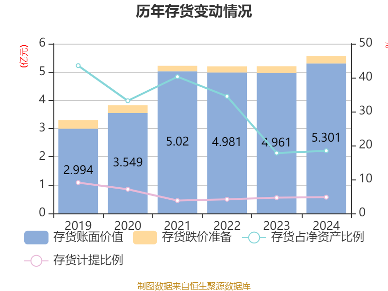 从存货变动来看,截至2024年末,公司存货账面价值为5.3亿元,占净资产的18.44%,较上年末增加3391.83万元。其中,存货跌价准备为2652.14万元,计提比例为4.77%。